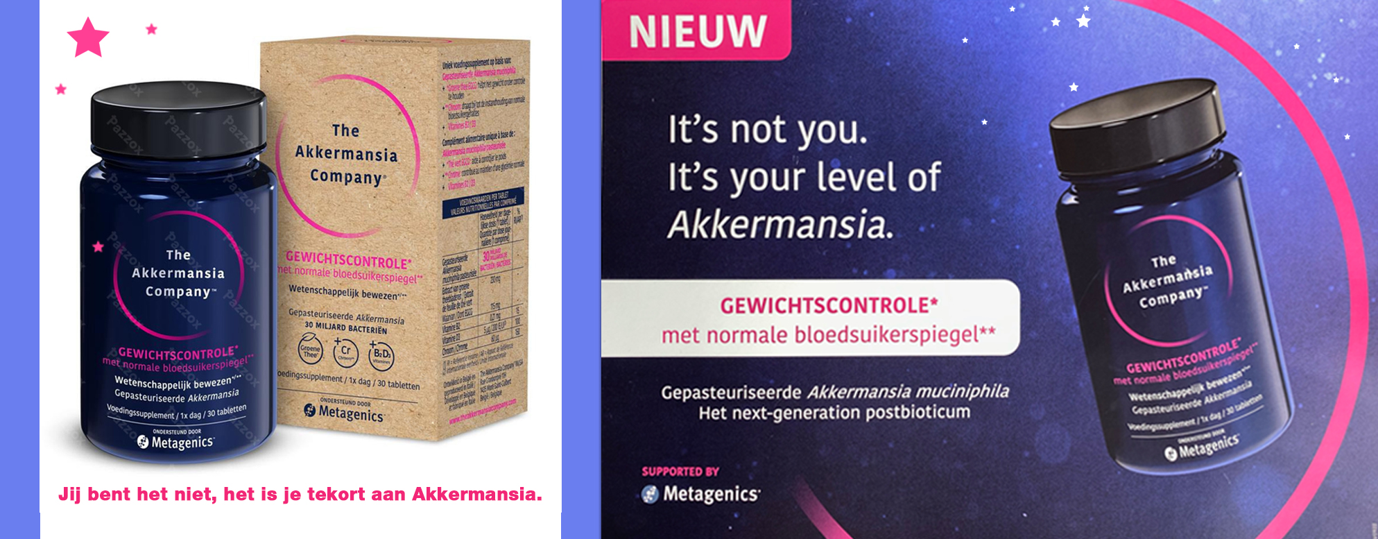 De bacteriestam Akkermansia muciniphila is ontwikkeld door Akkermansia Company, een spin-off van de Universiteit van Wageningen (Nederland) en de UCLouvain (België). Het supplement wordt exclusief op de markt gebracht door Metagenics, een toonaangevende speler in de wereld van voedingssupplementen in de Benelux. In België is Metagenics een vertrouwde partner van artsen en apothekers.