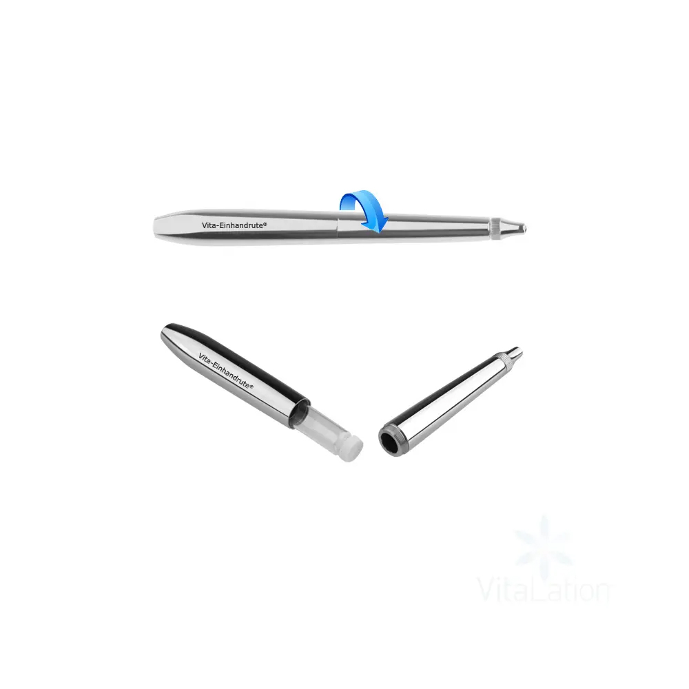 De Vita-Eén-hand-wichelroede Silver Profi Set is een hoogwaardige, handgemaakte wichelroede van voedselveilig en anti-allergisch roestvrij staal. Deze professionele roede is ideaal voor wichelroedelopers, natuurgeneeskundigen, geopathologen en bouwbiologen. Dankzij het verfijnde ontwerp, de verstelbare antenne (10 cm) en de 4 mm aansluiting voor accessoires, biedt deze wichelroede optimale trillingsgevoeligheid en gebruikscomfort. Het handvat is schroefbaar en maakt het mogelijk om eenvoudig monsters te plaatsen. Zowel draad als antenne zijn vervangbaar of los van elkaar te gebruiken. Geproduceerd in Duitsland met aandacht voor kwaliteit en precisie.