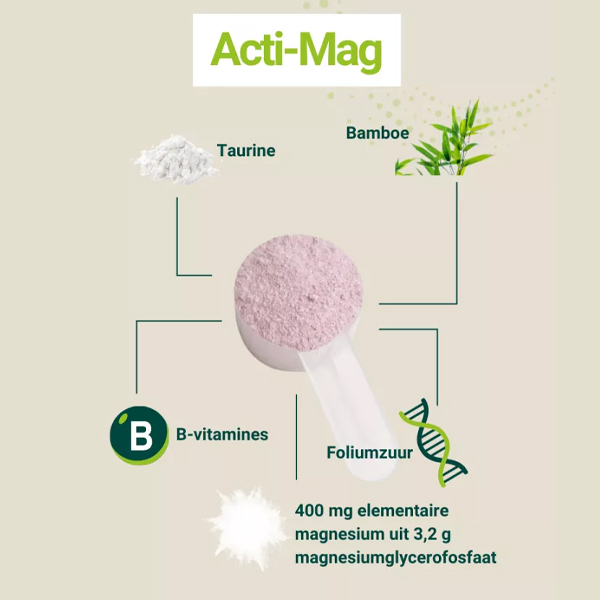 Acti-Mag plus met natuurlijke bessensmaak is een magnesiumpreparaat met actieve B-vitamines en taurine. Die samenstelling zorgt voor een uitzonderlijk goede opneembaarheid en biologische beschikbaarheid van magnesium.
