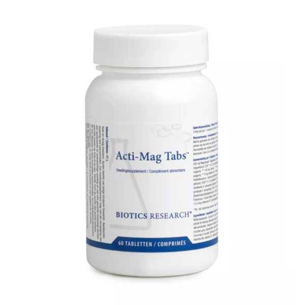 Acti-Mag Tabs is een magnesiumpreparaat in tabletvorm met magnesiumglycerofosfaat, aangevuld met B-vitaminen (incl. B12), folaat, taurine en bamboe-extract (silicium). Handig voor wie tabletten verkiest boven poeder.
