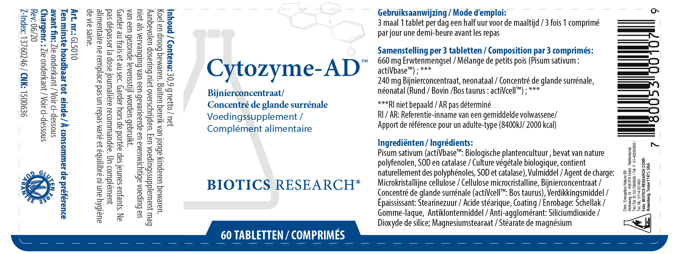 Biotics Research is voortdurend gericht op de optimalisatie van haar producten. Eigen onderzoek geeft aan dat bijnierextract afkomstig van varkens, beter kan worden geëxtraheerd (grotere concentratie) en zo effectiever is. Om die reden is Cytozyme-AD™ opnieuw geformuleerd. Cytozyme-AD™ bevat vanaf nu een uniek gepatenteerd complex van zowel runder- als varkensweefselconcentraat zodat de gezondheid en het functioneren van de bijnieren optimaal ondersteund kunnen worden. Cytozyme-AD™ is een milde formule die geen aanvullende (fyto)nutriënten bevat daar die soms overprikkeling kunnen veroorzaken. Bovendien bevat Cytozyme-AD™ de antioxidantenzymen superoxide dismutase (SOD) en catalase, beide afkomstig van de unieke plantencultuur die als tabletteerbasis wordt gebruikt. Deze herformulering biedt dezelfde potentie als de vorige formule en vereist geen dosisaanpassingen.