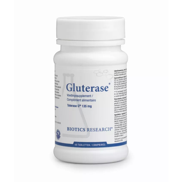 Biotics Gluterase is een enzymformule met Tolerase® G (AN-PEP; prolyl-oligopeptidase), bedoeld voor gebruik tijdens maaltijden die gluten (of restfracties) kunnen bevatten. De tablet bevat daarnaast plantaardige componenten en wordt geproduceerd met actiVbase® (tablet op basis van plantencultuur als drager).