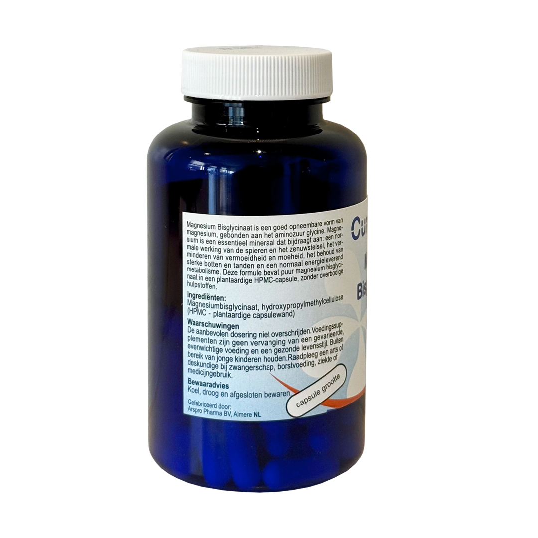 Cura Vitalis Magnesium Bisglycinaat bevat een zuivere, goed opneembare vorm van magnesium die gebonden is aan het aminozuur glycine. Deze binding staat bekend om haar uitstekende biologische beschikbaarheid en milde werking op het lichaam.