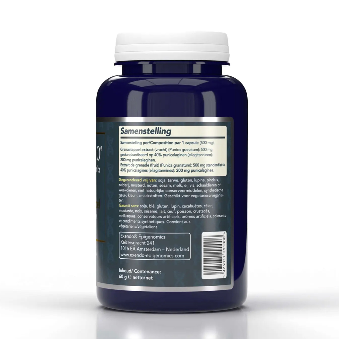 Deze samenstelling is een exclusieve formule binnen het Exendo Epigenomics-assortiment. Het extract wordt op maat gemaakt en getest door een extern laboratorium, waarbij onder meer gehalte aan punicalaginen, punicalagine A en B, zware metalen, contaminanten, microbiologische parameters en residuen worden gecontroleerd. Doordat alleen het vruchtvlees wordt gebruikt en niet de schil, blijft de kwaliteit consistent. Daarnaast is dit product volledig vrij van magnesiumstearaat, zodat de oplosbaarheid optimaal blijft.