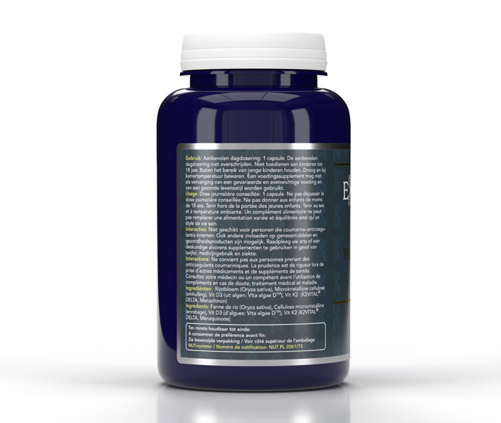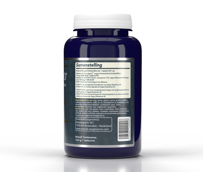 Vegan Vitamine D3 75 mcg/3.000 IE + K2 is een exclusieve samenstelling van Exendo® Epigenomics. |