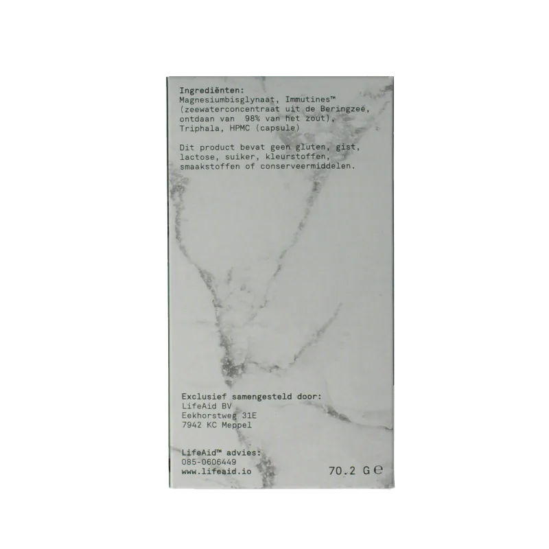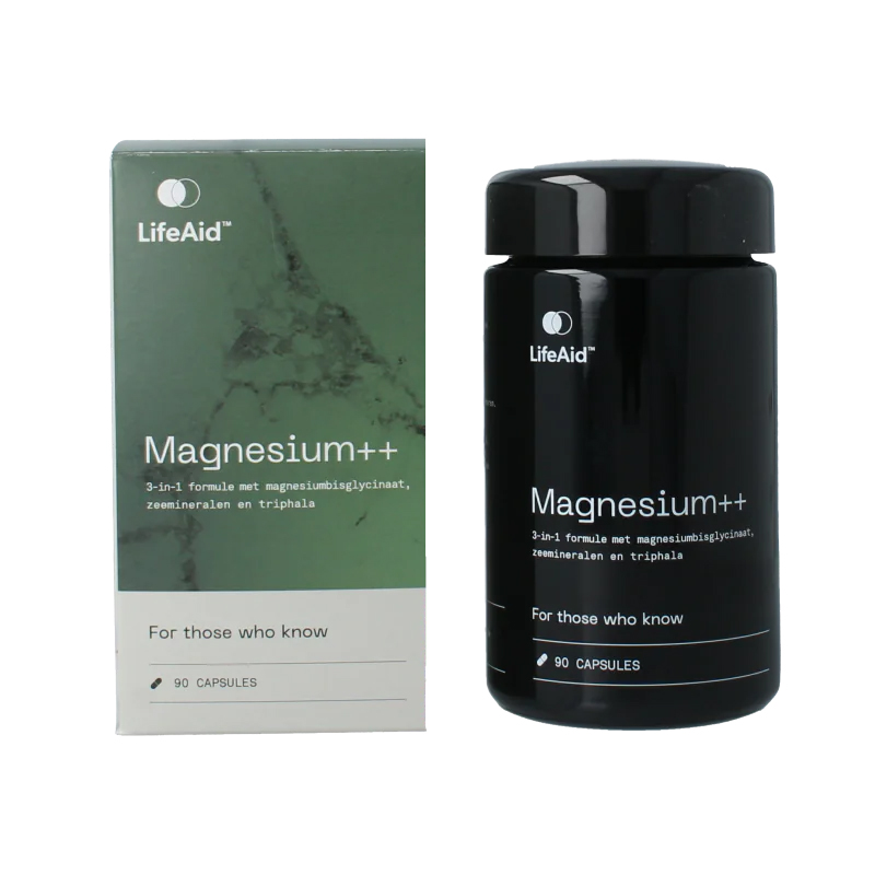 LifeAid™ Magnesium++ is een zorgvuldig samengestelde formule met magnesium bisglycinaat, aangevuld met een natuurlijk zeewaterconcentraat (Immutines™) en de Ayurvedische kruidencombinatie triphala. Deze combinatie past binnen een bewuste leefstijl en onderscheidt zich door zuiverheid en samenstelling.
