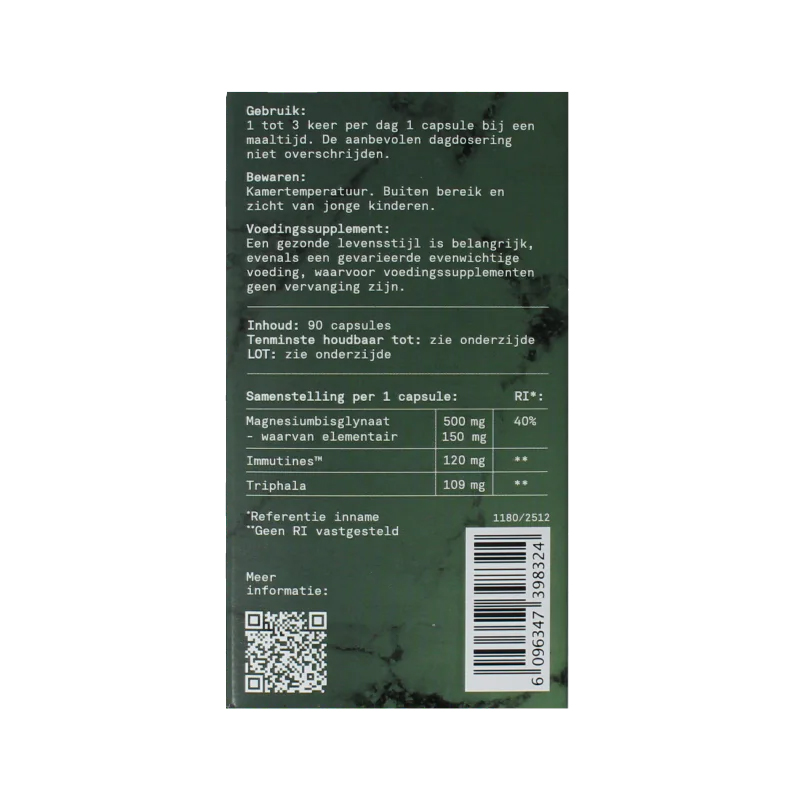 Magnesiumbisglycinaat, Immutines™ (zeewaterconcentraat uit de Beringzee, ontdaan van 98% natrium), triphala, HPMC (plantaardige capsule).