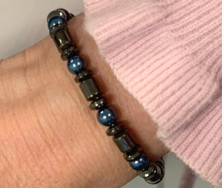 Magneetarmband, gemaakt van gemagnetiseerde Hematiet en gekleurde parelmoer.