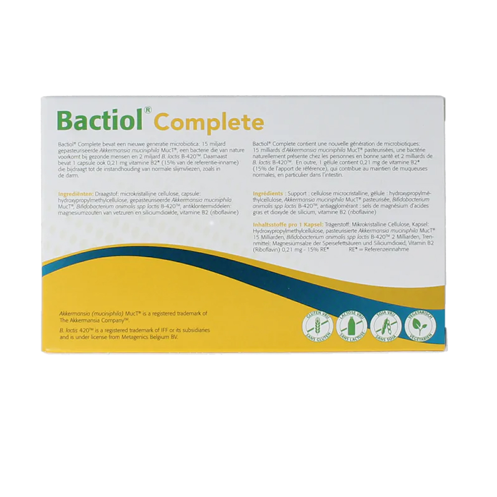 Metagenics Bactiol Complete NDF is een voedingssupplement met een unieke combinatie van gepasteuriseerde Akkermansia muciniphila en Bifidobacterium animalis spp. lactis B-420™. Per capsule bevat het 17 miljard bacteriën, aangevuld met vitamine B2 (riboflavine). Dankzij de ProtectAir®-technologie is het product stabiel bij kamertemperatuur en resistent tegen maagzuur en galzouten.