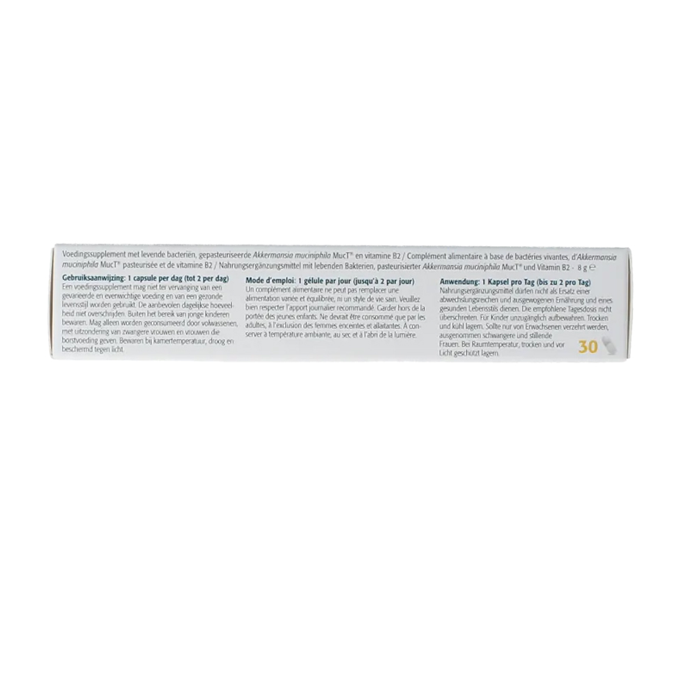 Microkristallijne cellulose (draagstof), hydroxypropylmethylcellulose (capsule), gepasteuriseerde Akkermansia muciniphila, Bifidobacterium animalis spp. lactis B-420™, magnesiumzouten van vetzuren en siliciumdioxide (antiklontermiddelen), vitamine B2 (riboflavine).