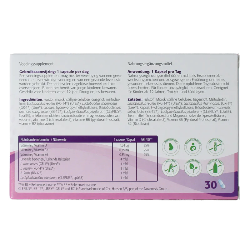 Vulstof: microkristallijne cellulose, draagstof: maltodextrine, Lactobacillus reuteri (RC-14®) (Urex®), Lactobacillus rhamnosus (GR-1®) (Urex®), capsule: hydroxypropylmethylcellulose, Bifidobacterium animalis subsp. lactis (BB-12®), Lactiplantibacillus plantarum (CLEPIUS®, Lpla33), antiklontermiddelen: siliciumdioxide en magnesiumzouten van vetzuren, vitamine D (cholecalciferol), vitamine B6 (pyridoxal-5-fosfaat), vitamine B2 (riboflavine).