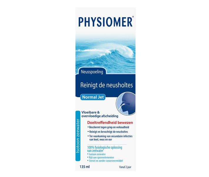 Physiomer Normal Jet spoelt, hydrateert en maakt de neusholten vrij. Physiomer Normal Jet wordt verstoven in de vorm van een dynamische straal en voert vloeibare secreties doeltreffend af.