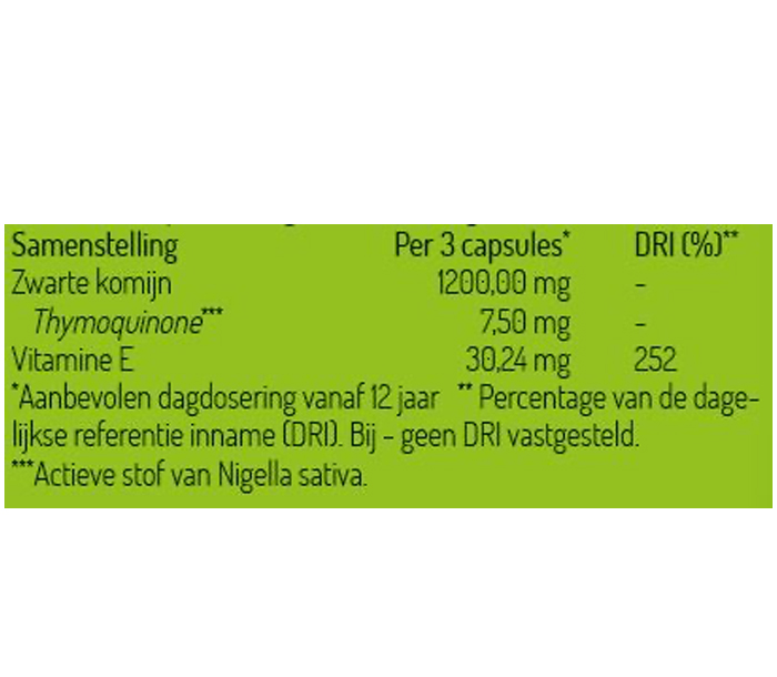 Zwarte komijn (nigella sativa), hydroxypropylmethylcellulose (coating capsule), d-alfa-tocoferol