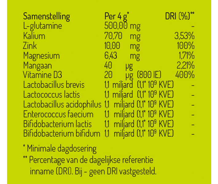 Ingrediënten: L-glutamine, probiotica (6 stammen), kalium, zink, magnesium, mangaan, vitamine D3.