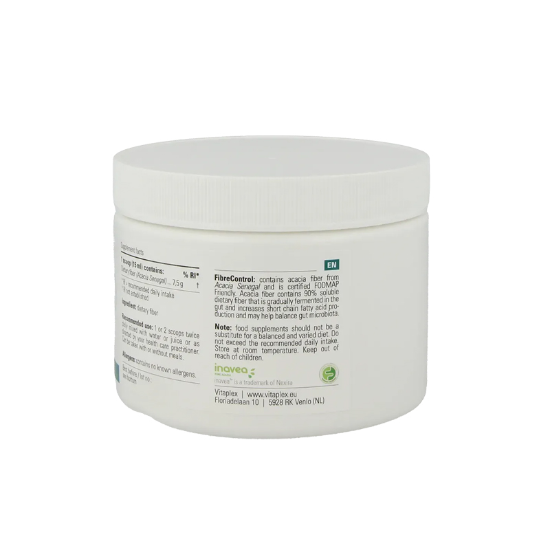 Vitaplex FibreControl is een biologisch gecertificeerd vezelsupplement met zuivere acaciavezels (Acacia Senegal). Deze oplosbare vezels zijn geschikt als aanvulling op de dagelijkse vezelinname en passen binnen een FODMAP dieet.